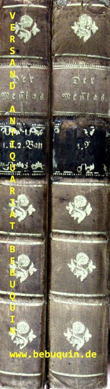 KLOPSTOCK, Friedrich Gottlieb: Der Messias. 2. verb. Aufl. 4 Bände in 2 Bänden. Halle (Hemmerde), 1760 – 1773. 15 Bl., 184, 160, 254, 208 (3) S. mit gestochenen Titeln und Buchschmuck. HLdr der Zeit. Ecken etwas bestoßen, ohne die Kupfertafeln. 1. vollständige Ausgabe.