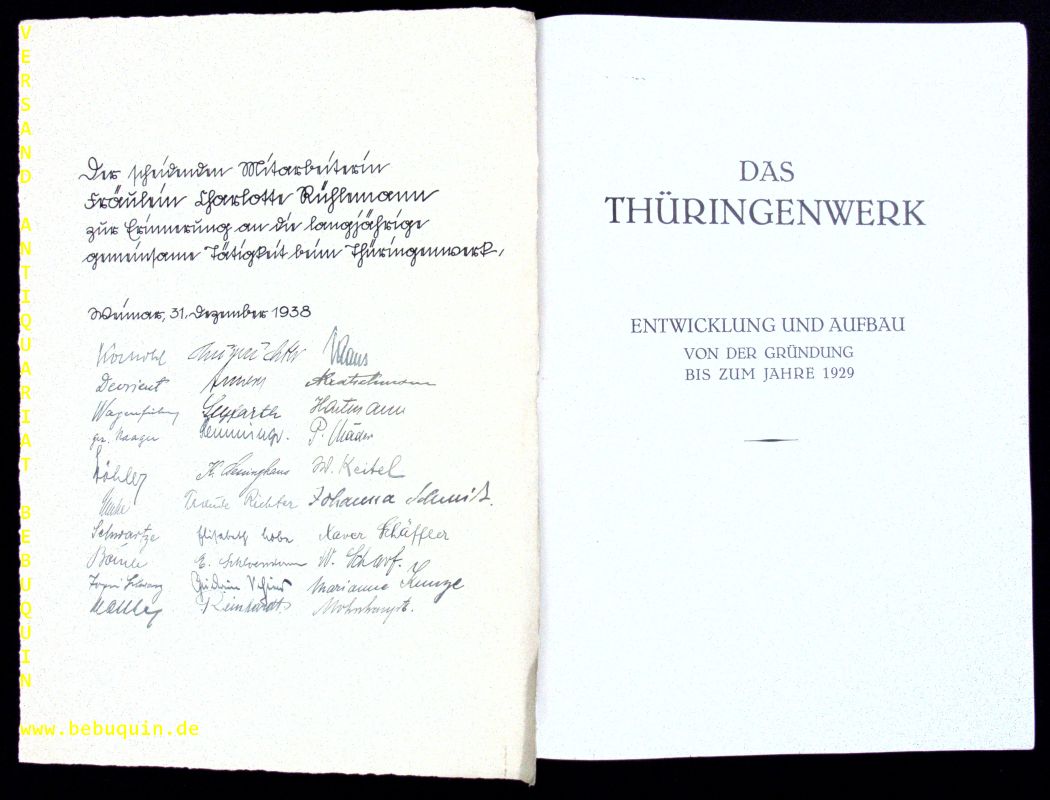 TECHNIK.– DAS THÜRINGENWERK.– Entwicklung und Aufbau von der Gründung bis zum Jahre 1929. Weimar (Uschmann), 1929. 4°. 42 S. mit zahlr. Abb. OKart. Umschlag minimal angeschmutzt, sonst tadelos. EA dieser Jubiläumsschrift mit diversen histosrischen Originaldokumenten von Mitarbeitern des Werks. Als da wäre: Urkunde für Kollektiv mit Unterschrift des Werkdirektors von 1971, Abschiedsurkunde von 1938 mit ca 30 Unterschriften der Kollegen etc. Die Thüringische Landeselektrizitätsversorgungs-Aktiengesellschaft, besser bekannt unter der Kurzbezeichnung Thüringenwerk, war in der Zeit von 1923 bis 1948 das überregionale Energieversorgungsunternehmen des Landes Thüringen. (Wikipedia)