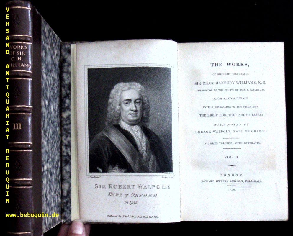 HANBURY WILLIAMS, Charles: The Works Of The Right Honourable Sir Chas. Hanbury Williams, K.B., Ambassador To The Courts Of Russia, Saxony, &c. From The Oiginals In The Possession Of His Grandson, The Right Hon. The Earl of Essex. With Notes By Horace Walpole, Earl Of Orford;. Bd. 2 und 3 (von 3). 2 Bände. London (Jeffery), 1822. VII, 272, 123 S., 2 Bl., xciv S. mit 2 gestochenen Portraitfrontispizen. HLdr um 1900 auf 6 Bünden und goldgeprägten Rücken . es fehlt Bd. 1, sonst feines Ex. 1. Aufl. dieser Ausgabe. Sir Charles Hanbury Williams (* 8. Dezember 1708 in London; † 2. November 1759, ebenda) war ein britischer Diplomat, Schriftsteller und Satiriker. (Wikipedia)