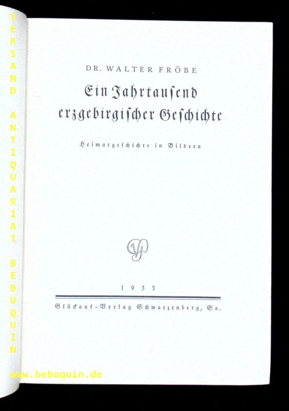 ERZGEBIRGE.– FRÖBE, Walter: Ein Jahrtausend erzgebirgischer Geschichte. Heimatgeschichte in Bildern. Schwarzenberg (Glückauf), 1933. Gr. 8. 200 S. OLn. etwas gebräunt, wenige Bleistiftunterstreichungen. EA.