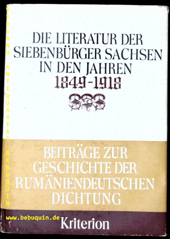 OSTGEBIETE.– GÖLLNER, Carl + Wittstock, Joachim (Hrsg.) Die Literatur der Siebenbürger Sachsen in den Jahren 1849 – 1918. Bukarest (Kriterion), 1979. 430 S. mit graph. Darst. OPb mit OUMschl. gutes Ex. = Beiträge zur Geschichte der rumäniendeutschen Dichtung. EA.
