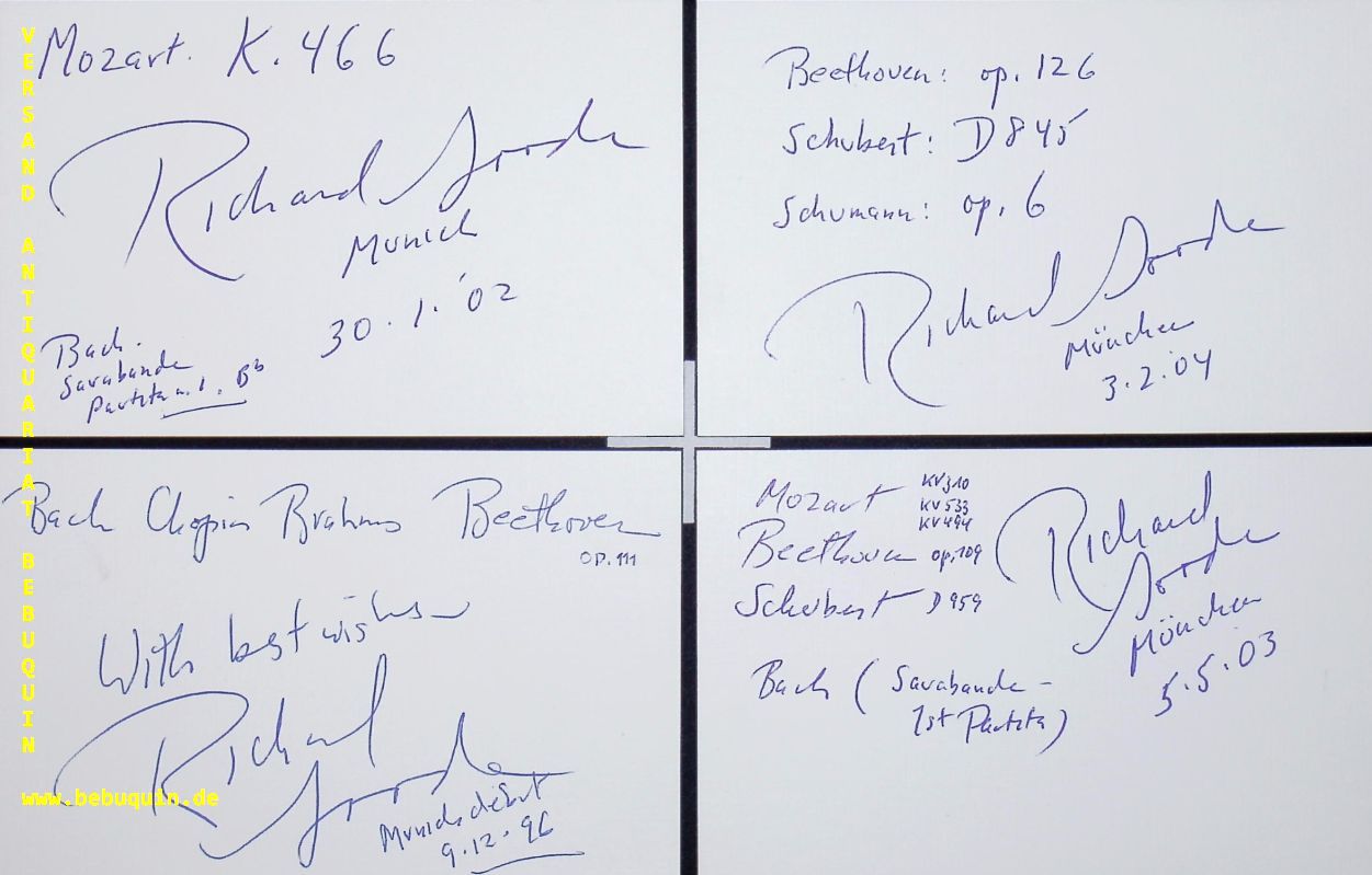 GOODE, Richard (Pianist): 4 eigenhändig signierte und datierte Autogrammkarten mit eigenhändigen Programmbeschreibungen. München (Herkulessaal), 1996 – 2004. 8 x 12,5 cm. 4 Karteikarten. Richard Goode (* 1. Juni 1943 in East Bronx, New York City, USA) ist ein US-amerikanischer Pianist. (Wikipedia)