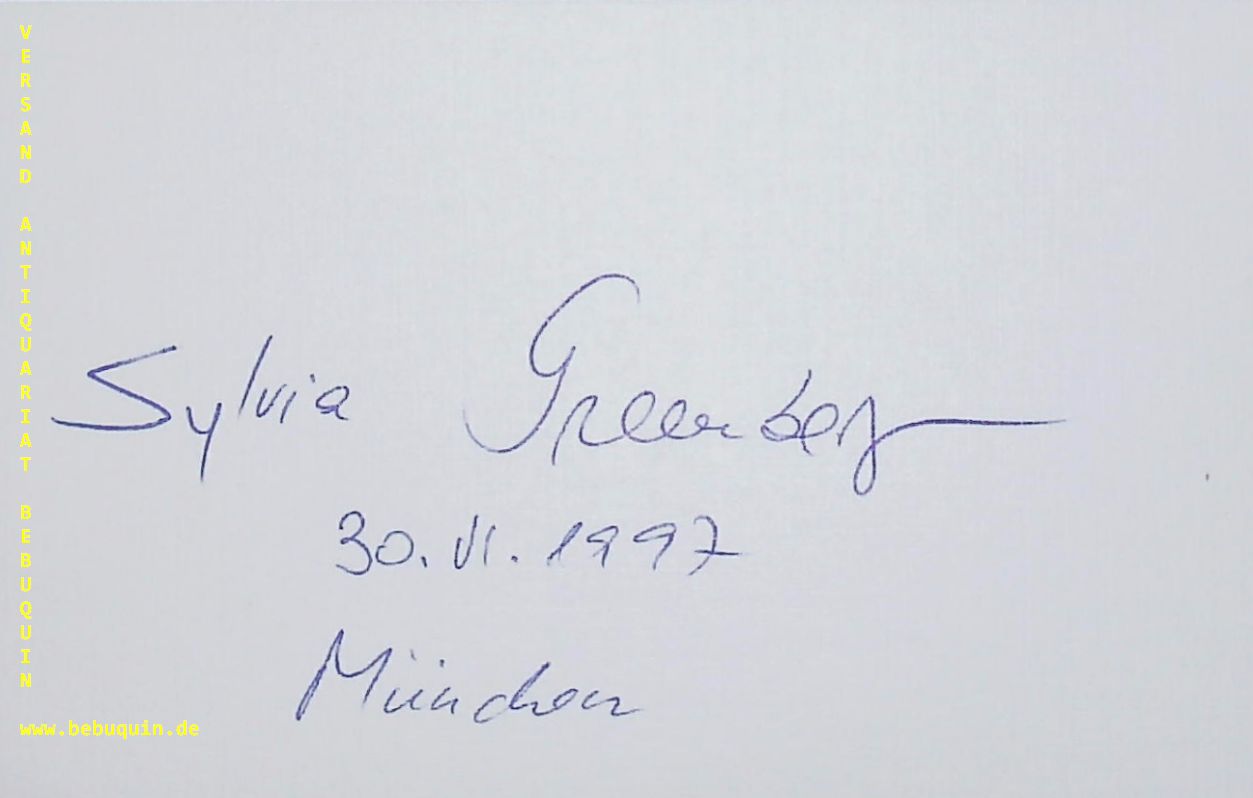 GREENBERG, Sylvia (Sopran): eigenhändig signierte und datierte Autogrammkarte. München (Philharmonie), 30.6.1997. 8 x 12,5 cm. Karteikarte. Sylvia Greenberg (* 1955 in Bukarest) ist eine rumänisch-israelische Opernsängerin (Koloratursopran) und Professorin für Gesang an der Hochschule für Musik und Theater München. (Wikipedia)