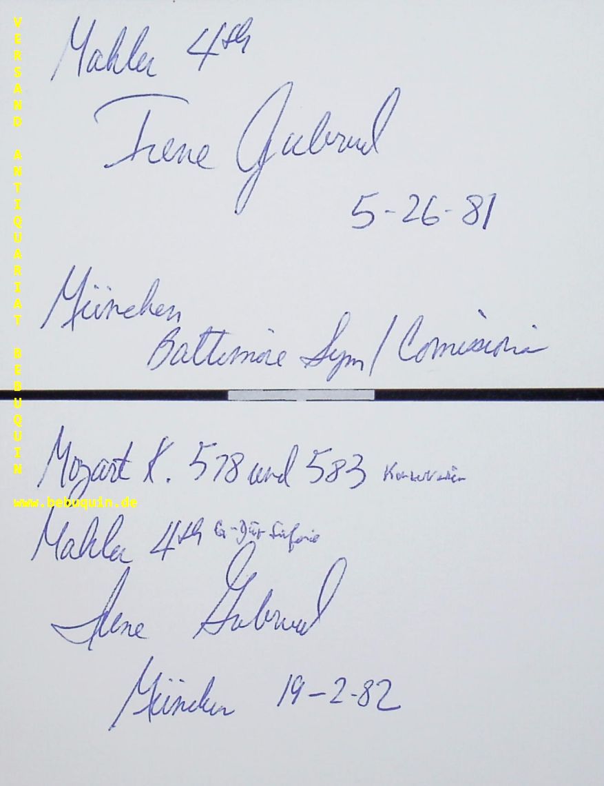 GUBRUD, Irene (Sopran): 2 eigenhändig signierte und datierten Autogrammkarten. München (Herkulessaal), 26.5.1981 + 19.2.1982. 8 x 12,5 cm. 2 Karteikarten.