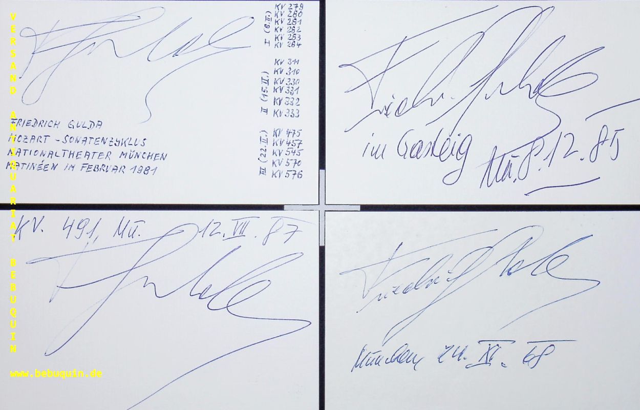 GULDA, Friedrich (Pianist, Komponist): 7 eigenhändig signierte und datierte Autogrammkarten mit diversen eigenhändigen Programmbeschreibungen. München, 1965 – 1987. 8 x 12,5 cm 7 Karteikarten. sehr interessantes Lot. Friedrich Gulda (* 16. Mai 1930 in Wien; † 27. Jänner 2000 in Weißenbach am Attersee) war ein österreichischer Pianist und Komponist. (Wikipedia)