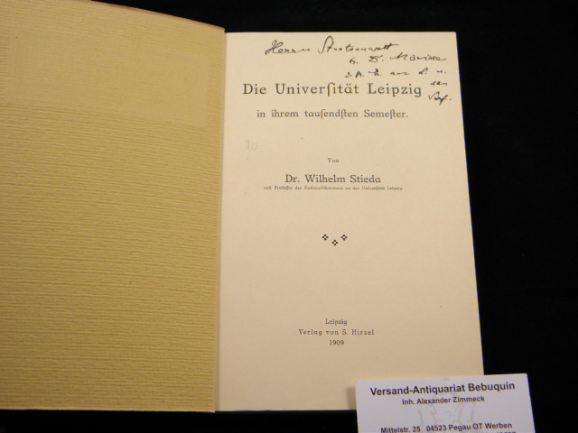 LEIPZIG.– STIEDA, Wilhelm: Die Universität Leipzig in ihrem tausendsten Semester. Leipzig (Hirzel), 1909. 169 (3) S. OKart. EA mit einer eigenhändigen Verfasserwidmung an den Staatsanwalt Möricke auf Titelseite.