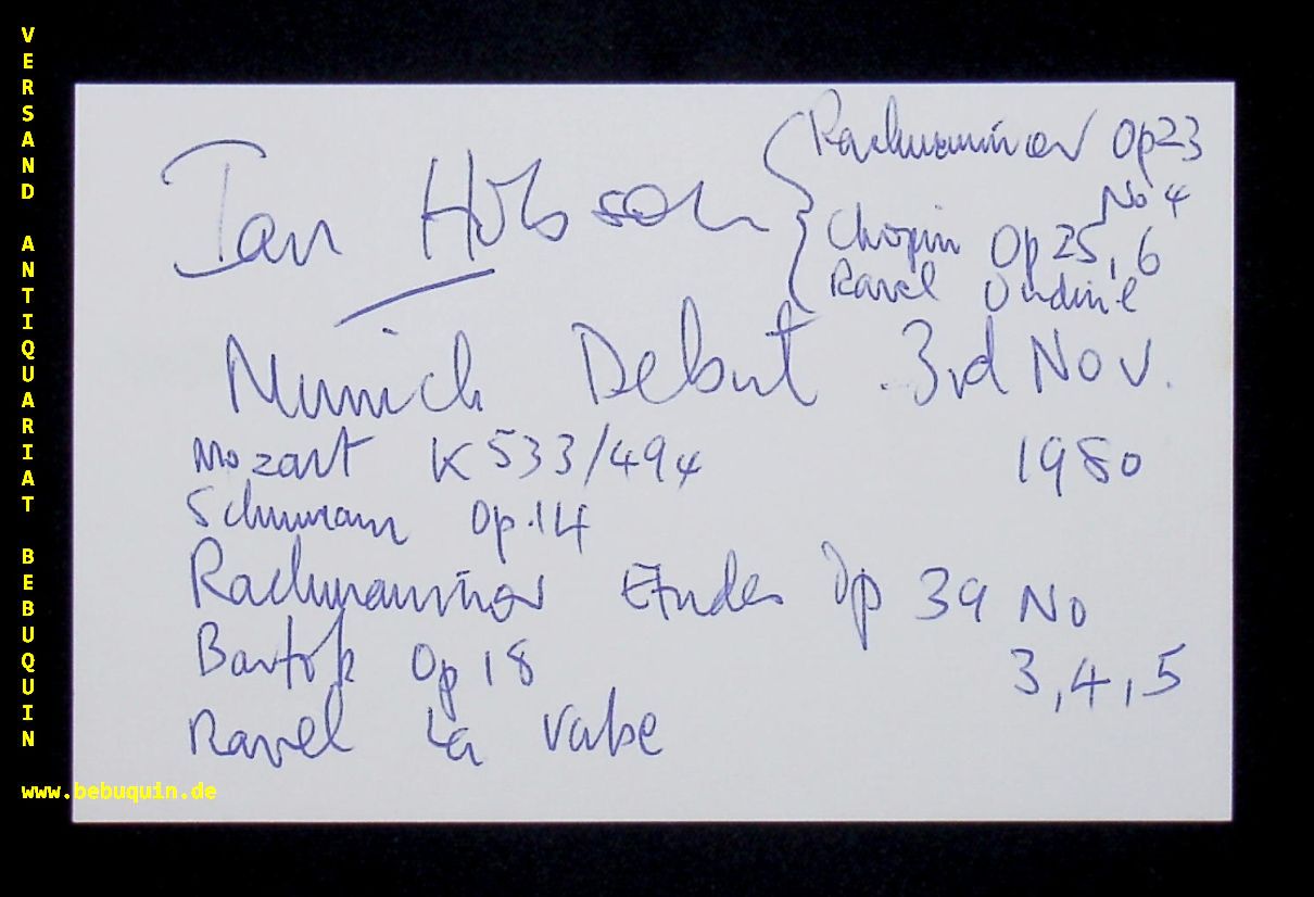 HOBSON, Ian (Pianist): eigenhändig signierte und datierte Autogrammkarte mit längeren eigenhändigen Programmbeschreibungen zum München Debut. München (Herkulessaal), 3.11.1980. 8 x 12,5 cm. Karteikarte. Ian Hobson (born 7 August 1952) is an English pianist, conductor and teacher, and is a professor at University of Illinois at Urbana–Champaign and at Florida State University. His pianistic repertoire spans the baroque to the contemporary, but he specialises in the Romantic repertoire. (Wikipedia)