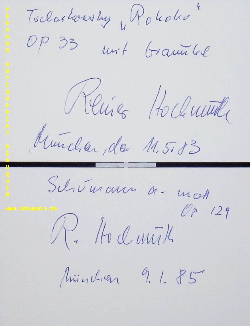 HOCHMUTH, Reiner (Cellist): 2 eigenhändig signierte und datierte Autogrammkarten. München (Herkulessaal), 1983 + 1985. 8 x 12,5 cm. 2 Karteikarte. Reiner Hochmuth, 1952 in Lübeck geboren, beginnt mit dem Cellounterricht im Alter von 10 Jahren.