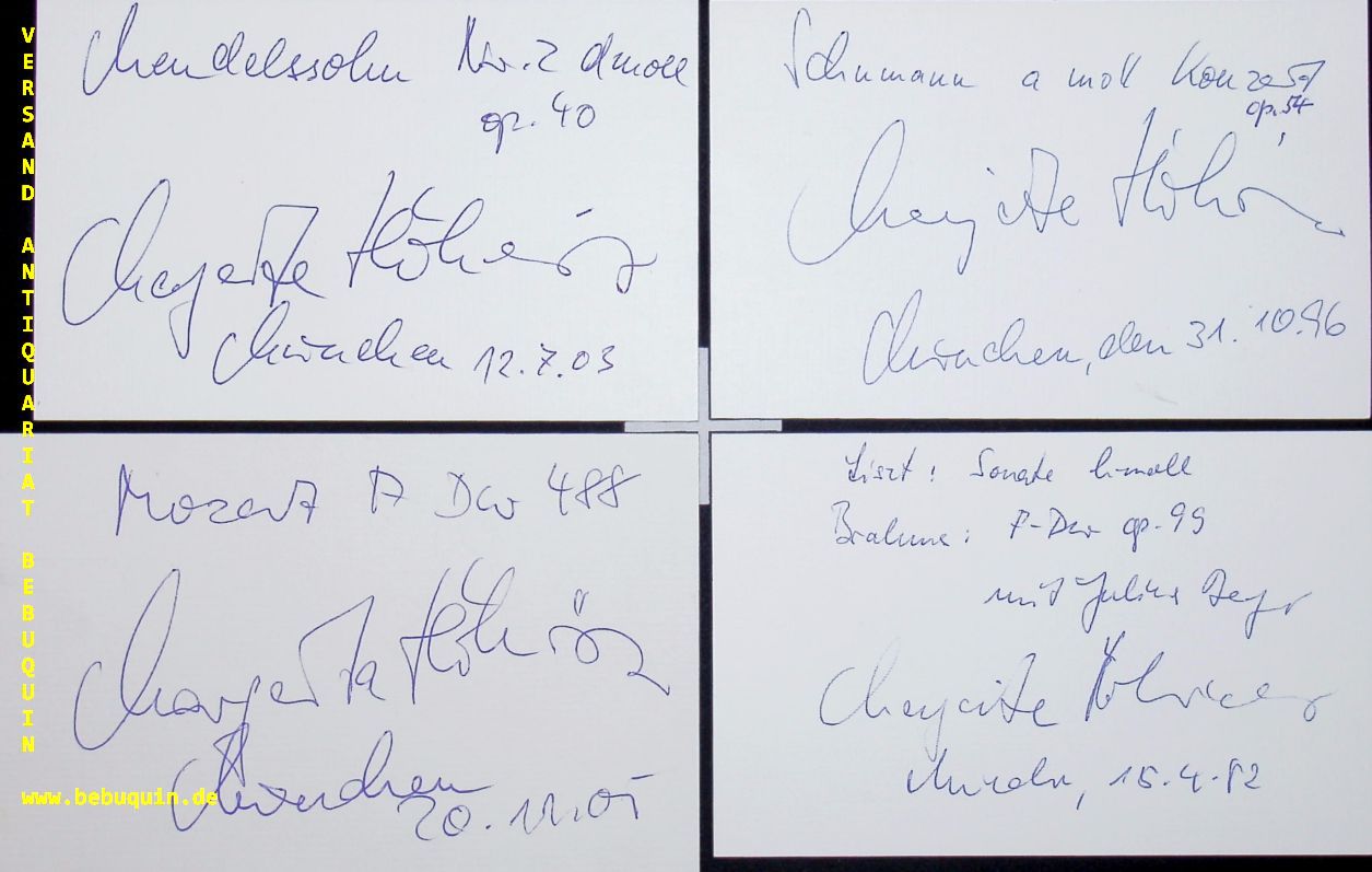 HÖHENRIEDER, Margarita (Pianistin): 4 eigenhändig signierte und datierte Autogrammkarten. München (Kongresssaal), 1982 – 2005. 8 x 12,5 cm. 4 Karteikarten. Margarita Höhenrieder (* 1956 in München) ist eine deutsche Pianistin und Professorin an der Hochschule für Musik und Theater München. (Wikipedia)