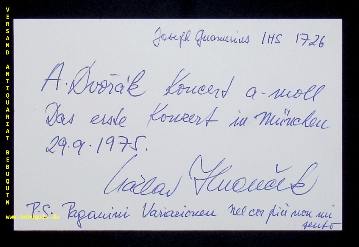 HUDECEK, Vaclav (Violinist): eigenhändig signierte und datierte Autogrammkarte mit umfangreicher eigenhändiger Programmbeschreibung. München, 29.9.1975. 8 x 12,5 cm. Karteikarte. Václav Hudecek (born June 7, 1952 in Rožmitál pod Tremšínem, Czechoslovakia) is a Czech violinist. A former student of David Oistrakh, Hudecek’s records have sold many copies in the Czech Republic, especially a 1992 recording of Vivaldi’s The Four Seasons, certified platinum. Hudecek also runs an annual academy for promising young Czech violinists. (Wikipedia)