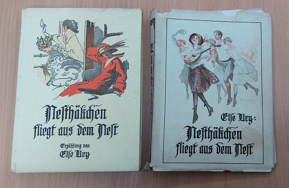 URY, Else: Nesthäkchen fliegt aus dem Nest. 104.-108. Tsd. Berlin (Meidinger), ca 1925. 192 S. mit 5 farb. Bildtafeln von R. Sedlacek. ill. OLn. mit OUmschl. von Sedlacek. Umschlag etwas fleckig und am Rand lädiert. = Band 6. (Klotz 7576/54)