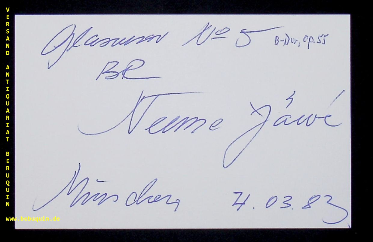 JÄRVI, Neeme (Dirigent): eigenhändig signierte und datierte Autogrammkarte. München, 4.3.1983. 8 x 12,5 cm. Karteikarte. Neeme Järvi (* 7. Juni 1937 in Tallinn) ist ein in Estland geborener Dirigent. Er ist seit 1987 US-amerikanischer Staatsbürger. (Wikipedia)