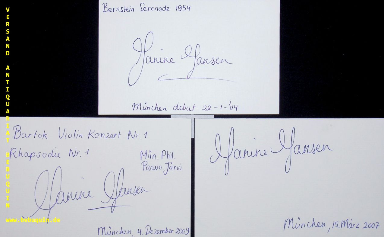 JANSEN, Janine (Violinistin): 3 eigenhändig signierte und datierte Autogrammkarten. München, 2004 – 2009. 8 x 12,5 cm. 3 Karteikarten. Janine Jansen (* 7. Januar 1978 in Soest, Provinz Utrecht, Niederlande) ist eine niederländische Violinistin. (Wikipedia)