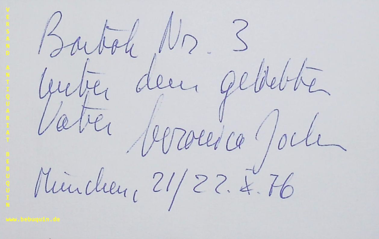 JOCHUM VON MOLTKE, Veronika (Pianistin): eigenhändig signierte und datierte Autogrammkarte: Bartok Nr. 3 unter dem geliebten Vater. München (Herkulessaal), 21.10.1976. 8 x 12,5 cm. Karteikarte. Veronica Jochum von Moltke, die ältere Tochter von Eugen Jochum, wurde in Berlin geboren. Sie studierte bei Eliza Hansen in Hamburg, an der Musikhochschule in München und gleichzeitig bei Edwin Fischer. Danach vervollkommnete sie ihre Studien bei Josef Benvenuti in Paris und Rudolf Serkin in den USA. In über 50 Ländern und vier Kontinenten konzertierte sie mit führenden Orchestern und bedeutenden Dirigenten wie Bernard Haitink, Sir Colin Davis und auch mit ihrem Vater. Außerdem spielte sie Kammermusik mit Partnern wie Natalia Gutman und dem Berliner Philharmonischen Quartett. Zur Besonderheit ihres Repertoires gehören kommentierte Konzerte, wie z.B. »Musik aus der Zeit des Blauen Reiters« und »Musik aus der Zeit des Bauhauses «, die sie auch selbst moderiert. Veronica Jochum von Moltke widmete sich besonders dem Gesamtwerk von Clara Schumann. 1961 heiratete sie den Architekten und Stadtplaner Willo von Moltke, Bruder des Widerstandskämpfers Hellmuth von Moltke. Seit 1965 hat sie eine Klavierprofessur in Boston. (Wikipedia)