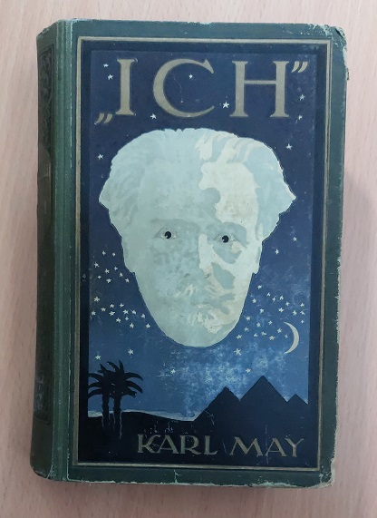 MAY, Karl: „ICH“. Aus Karl May’s Nachlaß. Hrsg. von E.A. Schmid. 2. Aufl. 6.– 10. Tsd Radebeul (Karl May), 1917. (8)588 (4) S. mit 5 Bildtafeln und den gemusterten Vorsätzen. farb. ill. OHLn. etwas schief gelesen, Kanten berieben , Ecken bestoßen, NaT. = Gesammelte Werke, Bd. 34. seltene 2. Auflage mit Ausfuhrzeichen Z XIX. (Hermesmeier / Schmatz GW 34.2.)