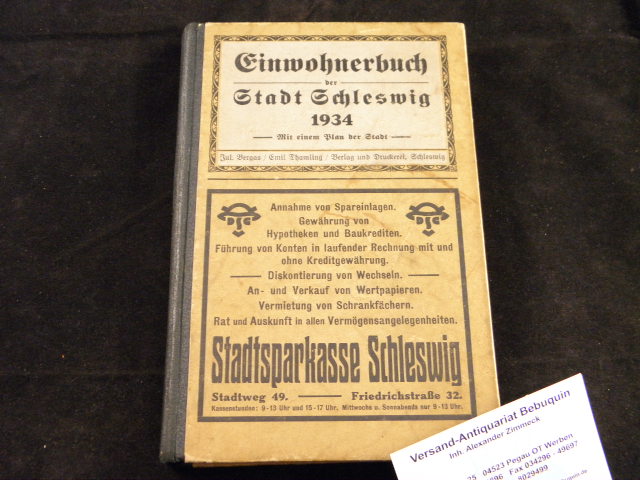SCHLESWIG.– EINWOHNERBUCH DER STADT SCHLESWIG 1934.– Bearb. nach der amtlichen Kartei des Einwohnermeldeamtes nach dem Stande vom 1. Juli 1934. Schleswig (Bergas), 1934. IX, 230 S., 16 S. ill. OHLn. Einband leicht gebräunt, eine Seite am Rand ohne Textverlust lädiert, sonst gut erhalten. Sehr sehr seltenes Adressbuch.