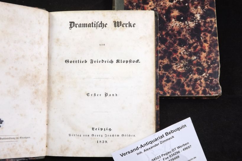 KLOPSTOCK, Friedrich Gottlieb: Dramatische Werke. 2 Bände. Leipzig (Göschen), 1839. kl. 8°. (6),370; (12),258 S. HLn der Zeit mit goldgeprägten Rücken. Schnitt und Titelblätter stockfleckig mit makuliertem Namenseintrag, sonst gut. = Dramatische Werke, Bd, 6 + 7. EA WG 46; Goedeke IV/1,177,57; KNLL 9/515 & 521. – Inhalt: Der Tod Adams; Hermanns Schlacht; David; Hermanns Tod; Salomo; Hermann und die Fürsten.