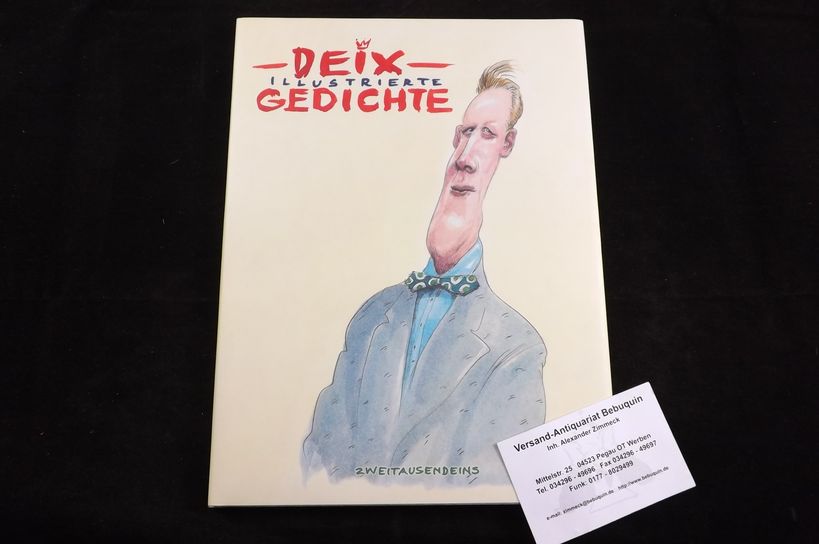 DEIX, Manfred: Illustrierte Gedichte. Frankfurt (Zweitausendeins), 2002. 4°. 84 S. mit 36 meist ganzseit. farb. Karikaturen u. 1 Foto. OLn mit OUmschl. in OSchuber. tadellos erhalten. Der auf 300 Exemplare limitierten und nummerierten Vorzugsausgabe ist ein für diese Ausgabe eigens gestaltetes handsigniertes Blatt beigefügt. Blatt und Buch mit identischer Nr: 259/300.