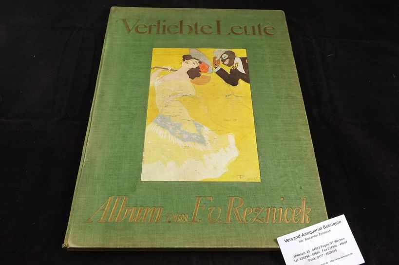 REZNICEK, Felicitas von: Verliebte Leute. Album. München (Langen), (1902). Fol. 2 Bl., 30 ganzseitigen und meist farbigen Karikaturen aus dem „Simplicissimus“ ill. OLn. Einband leicht berieben, letztes Blatt mit kleinem Randeinriss. EA des schönen Jugendstil Reznicek-Albums.