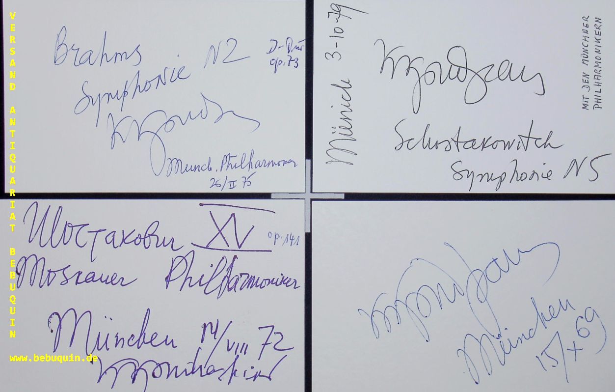 KONDRASCHIN, Kyril (Dirigent): 5 eigenhändig signierte und datierte Autogrammkarten. München (Philharmonie), 1969 – 1980. 8 x 12,5 cm. 5 Karteikarten. Kirill Petrowitsch Kondraschin (* 21. Februar in Moskau; † 8. März 1981 in Amsterdam) war ein russischer Dirigent. (Wikipedia)