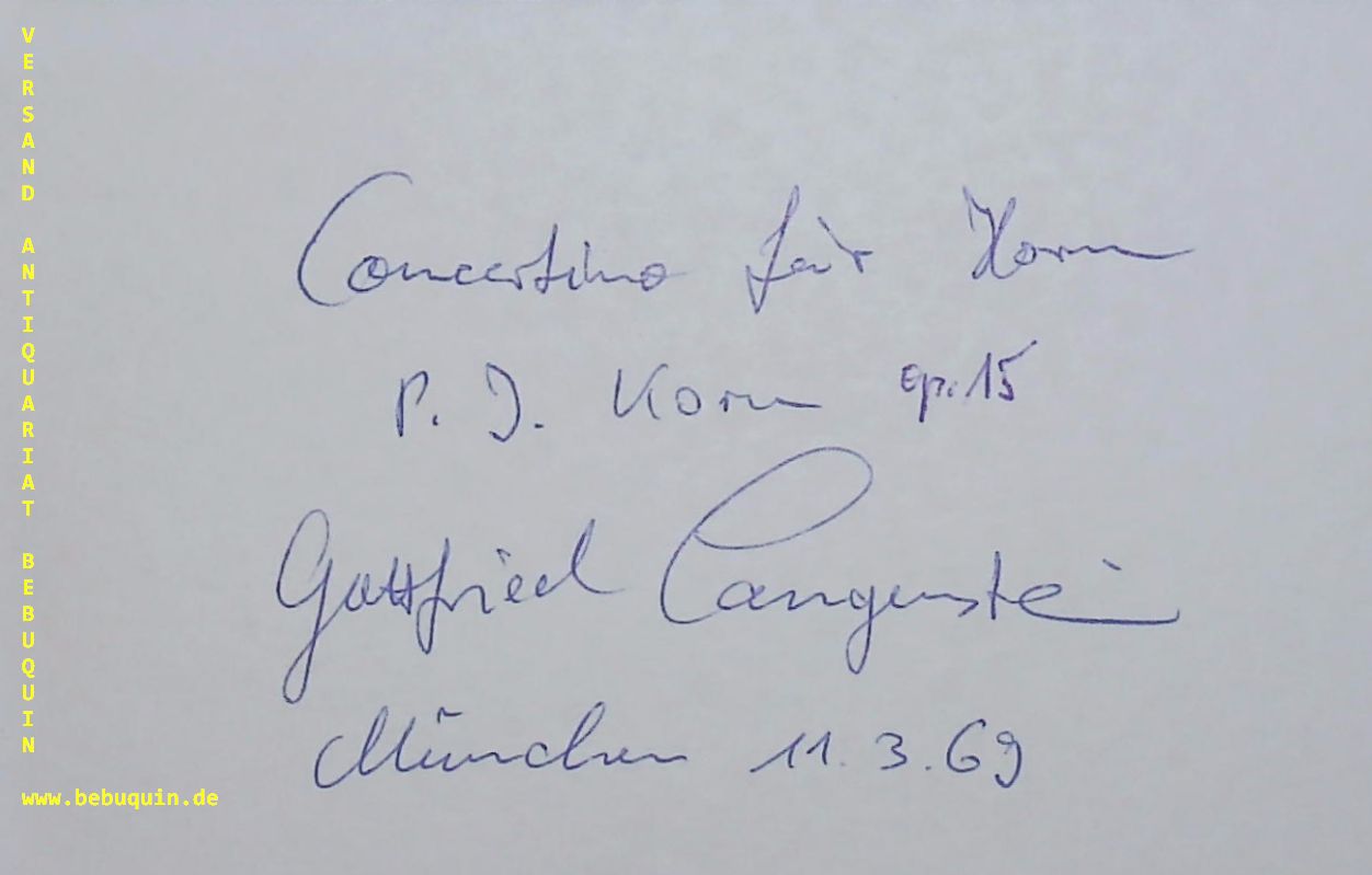 KORN, Peter Jona (Komponist) + LANGENSTEIN, Gottfried (Hornist): eigenhändig von beiden signierte und datierte Autogrammkarte. München (Herkulessaal), 11.3.1969. 8 x 12,5 cm. Karteikarte. Peter Jona Korn (* 30. März 1922 in Berlin; † 12. Januar 1998 in München) war ein deutscher Musiker und Komponist. (Wikipedia)