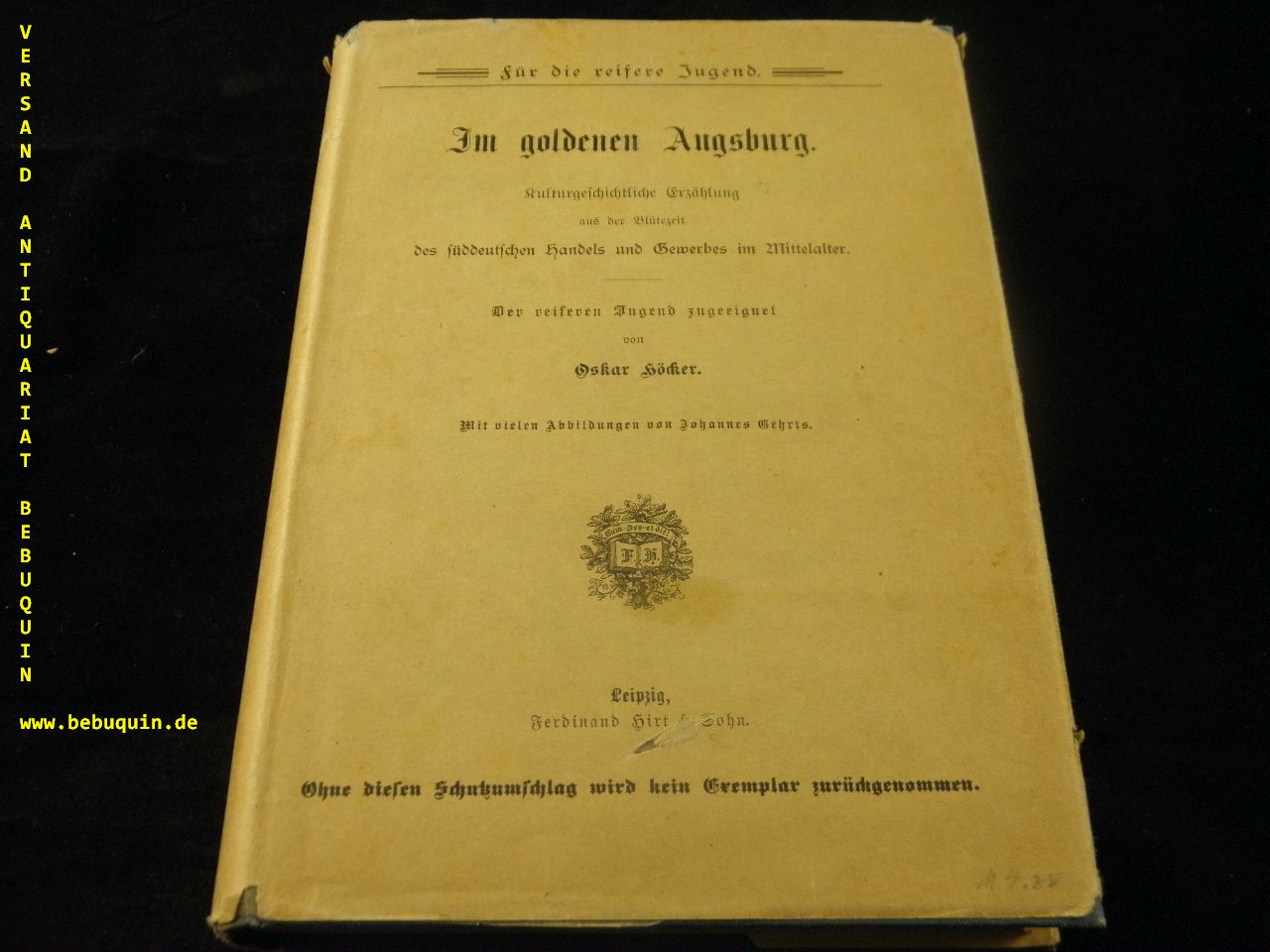 HÖCKER, Oskar: Im goldenen Augsburg. Kulturgeschichtliche Erzählung aus der Blütezeit des süddeutschen Handels und Gewerbes im Mittelalter. Der reiferen Jugend zugeeignet. 2. Aufl. Leipzig (Hirt & Sohn), 1895. Gr. 8°. 240, 16 S. mit vielen Abb. von Johannes Gehrts. ill. OLn. mit OUmschl. gutes Ex. = Merksteine deutschen Bürgertums, Bd. 4. Klotz 2729/7.