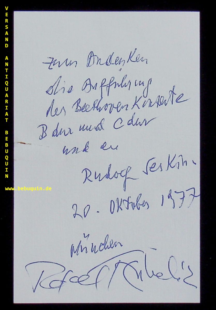 SERKIN, Rudolf (Pianist) + KUBELIK, Rafael (Dirigent): eigenhändig von beiden signierte und datierte Autogrammkarte: Zum Andenken die Aufführung der Beethoven Kantate B dur und C dur. München (Herkulessaal), 20.10.1977. 8 x 12,5 cm. Karteikarte. Rudolf Serkin (* 28. März 1903 in Cheb; † 8. Mai 1991 in Guilford, Vermont) war ein österreichischer Pianist mit amerikanischer Staatsbürgerschaft. (Wikipedia)