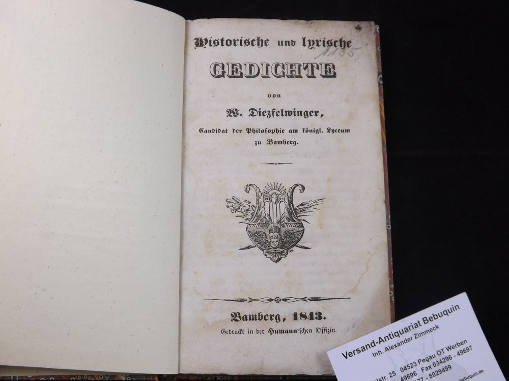 DIEZFELWINGER, Wilhelm: Historische und lyrische Gedichte. Bamberg (Humann), 1843. VIII, 104 S. mit gestochener Titelvignette. neuer Pb. durchweg schmutzrandig. EA des Erstlingswerks.