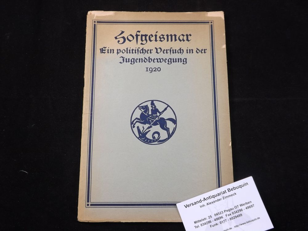 EHMER, Wilhelm: (Hrsg.) Hofgeismar. Ein politischer Versuch in der Jugendbewegung 1920. Jena (Diederichs), 1921. Gr. 8°. 75 S. OKart. Kanten lädiert. Sehr seltene EA des Erstlings. Da Ehmer sich der Wandervogel-Bewegung verbunden fühlte, in die er als Gymnasiast eingetreten war, gab er 1921 eine Broschüre heraus, in der verschiedene Autoren, so der Philosoph Hermann Graf Keyserling und der Pädagoge Harald Schultz-Hencke, ein 1920 in Hofgeismar veranstaltetes Treffen zur Gründung einer „Einheitsfront der deutschen Jugend“ würdigten.
