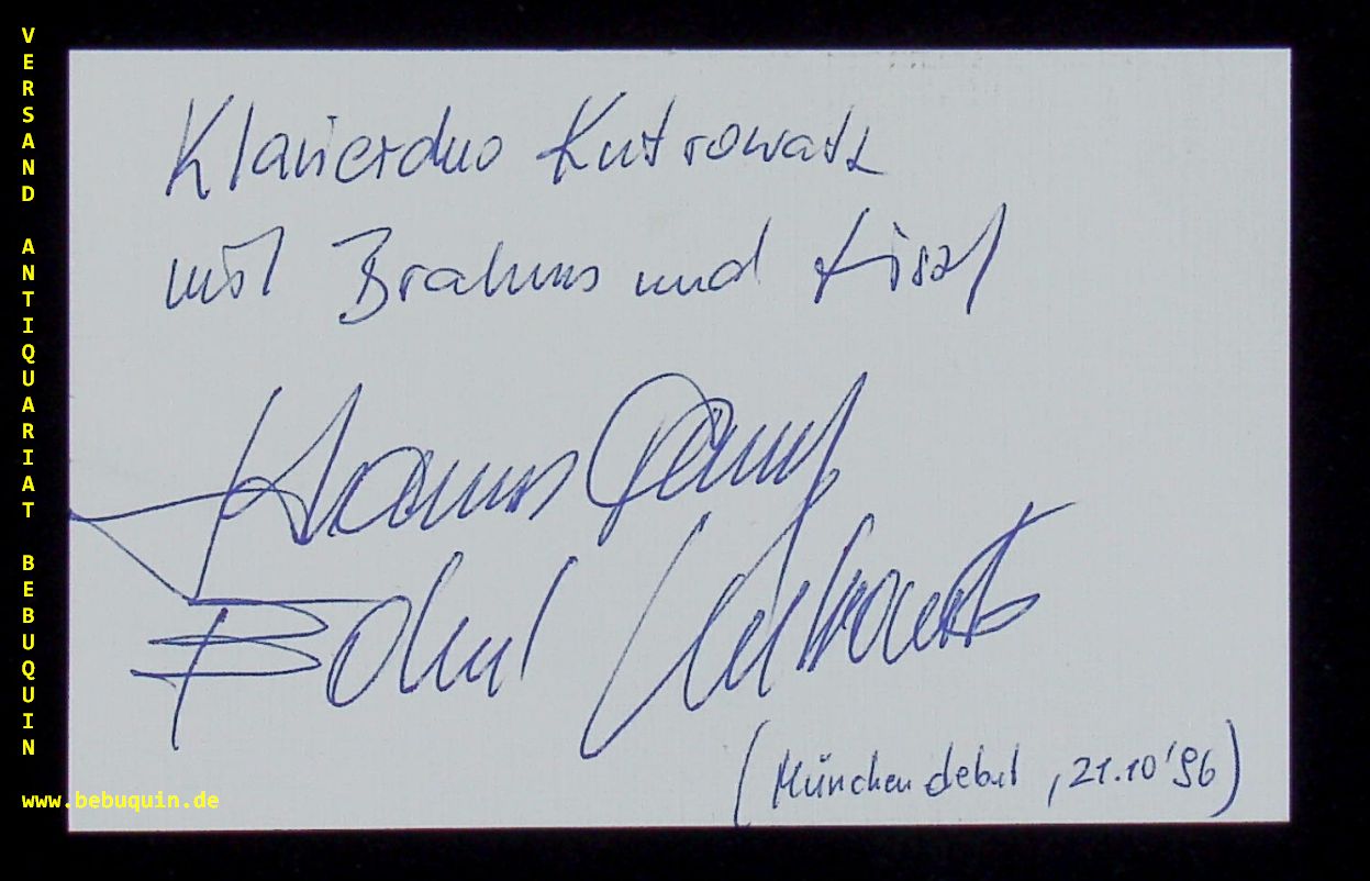 KUTROWATZ, Johannes + Eduard (Klavier-Duo): von beiden eigenhändig signierte und datierte Autogrammkarte. München debut. München (Kongresssaal), 21.10.1996. 8 x 12,5 cm. 2 Karteikarten. Eduard und Johannes Kutrowatz bilden ein österreichisches, international tätiges Klavierduo. Beide lehren an der Universität für Musik und darstellende Kunst in Wien, sowie im Rahmen einer Gastprofessur in Tokyo/Japan. Eduard Kutrowatz ist auch als Komponist, Johannes Kutrowatz als Dirigent tätig. Ihre Konzertreisen als Klavierduo, Kammermusikpartner, Solisten, Liedbegleiter und Dirigenten führten um die ganze Welt. (Wikipedia)
