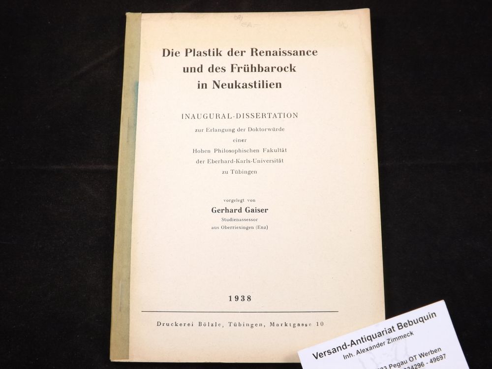 GAISER, Gerhard: (eig. Gerd) Die Plastik der Renaissance und des Frühbarock in Neukastilien. Inaugural-Dissertation. Tübingen (Bölzle), 1938. 83 S. Interimsrücken. Kanten gering bestoßen. sehr seltene EA des Erstlings WG² 1.