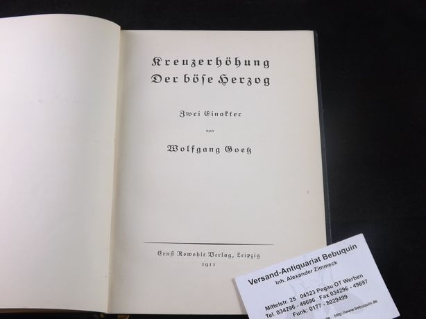 GOETZ, Wolfgang: Kreuzerhöhung – Der böse Herzog. Zwei Einakter. Leipzig (Rowohlt), 1911. 74 S., 1 Bl. Handgebundenes OLdr. mit goldgeprägtem Rücken. StaV, teils leicht ausgebunden. Sehr seltene Leder-EA des Erstlingswerks mit einer sehr persönlichen, handschriftlichen, 7-zeiligen Widmung des Verfassers: „Ich fühle es wohl, noch bin ich nicht zurück! …″ (WG² 1; Ahnert 780)