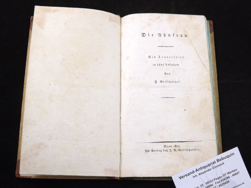 GRILLPARZER, Franz: Die Ahnfrau. Ein Trauerspiel in 5 Aufzügen. Wien (Wallishausser), 1817. 4 Bl., 131 S. HLdr. der Zeit mit goldgeprägtem Rücken. teils etwas braunfleckig, insgesamt gutes Ex. EA des Erstlings WG² 1.