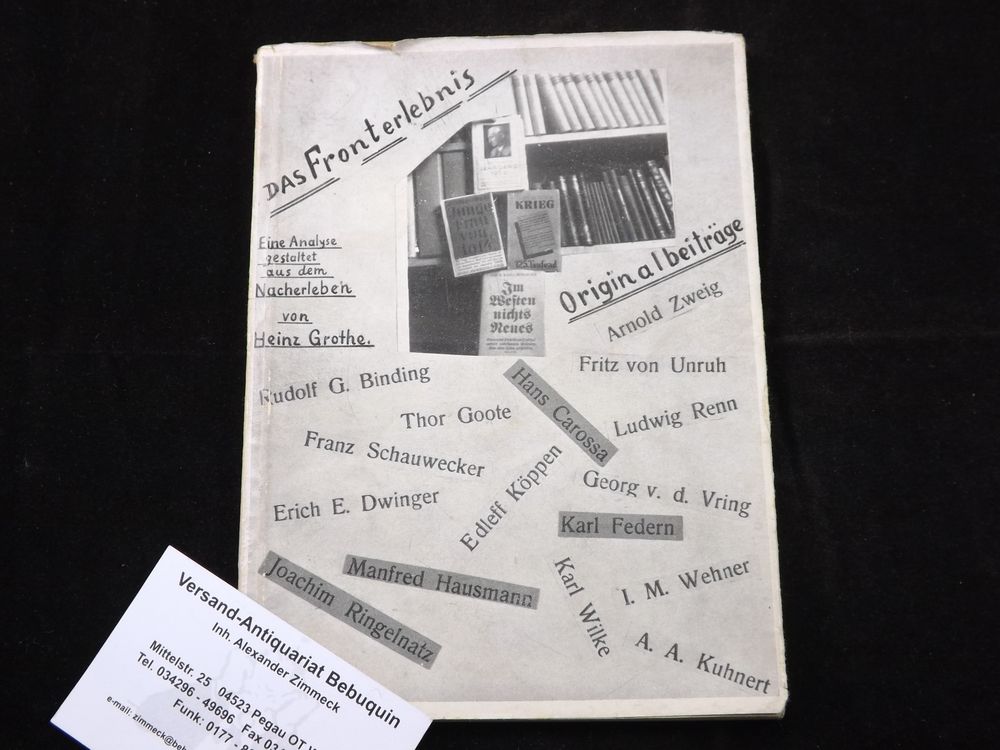 GROTHE, Heinz: Das Fronterlebnis. Eine Analyse, gestaltet aus dem Nacherleben. Berlin (Joachim Goldstein), 1932. 87 S. ill. OKart. gering bestoßen und bestaubt. EA des Erstlingswerks des Schwiegersohns von Hans Franck.