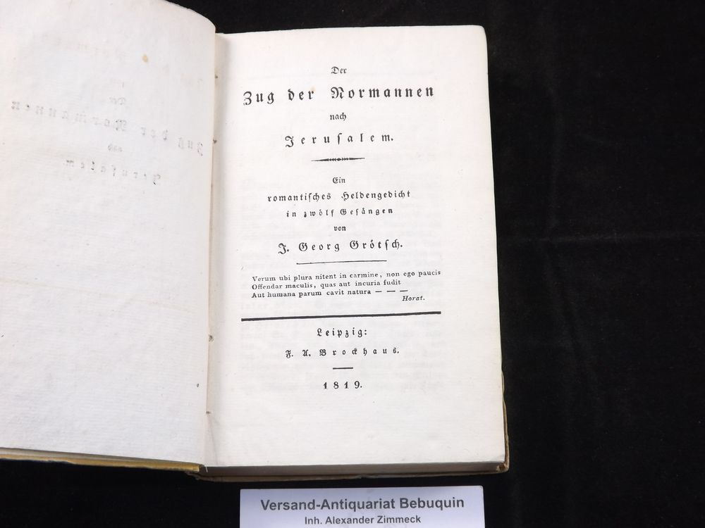 GRÖTSCH, J. Georg: Der Zug der Normannen nach Jerusalem. Ein romantisches Heldengedicht in zwölf Gesängen. Leipzig (Brockhaus), 1819. kl. 8°. VIII, 383 (1) S. ill. OPb. Einband etwas angeschmutzt, sonst sehr gut. seltzene EA des Erstlingswerks des Münchener Dramatikers. Kosch VI, 845.