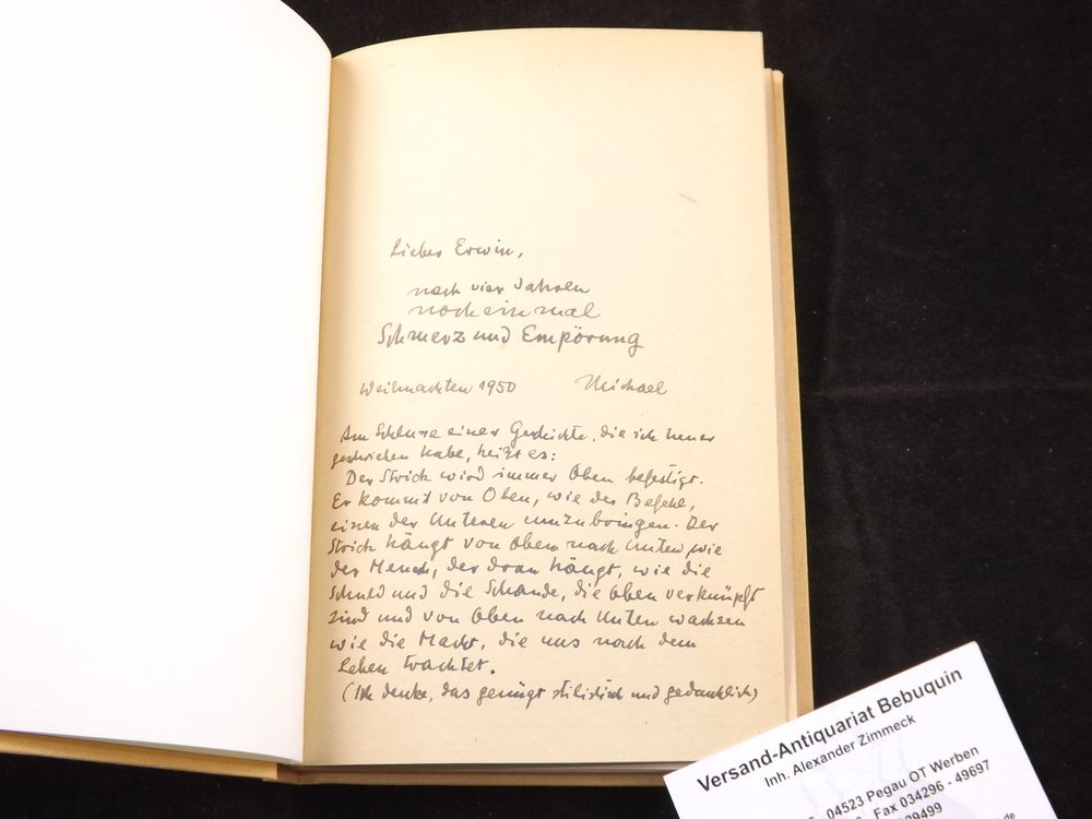 GUTTENBRUNNER, Michael: (Hrsg.) Schmerz und Empörung. Eine Anthologie. Sekirn, (Eduard Kaiser), 1946. 85 (3) S. neues Ln. mit aufgesetzten Originaldeckeln und -rücken. sehr seltene EA des Erstlingswerks mit einer ausführlichen, eigenhändigen, datierten Verfasserwidmung auf Vorsatz.