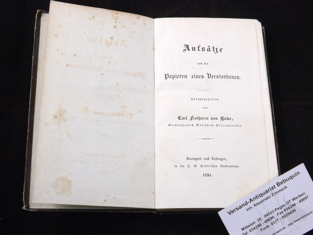 HACKE, Carl Freiherr von: Aufsätze aus den Papieren eines Verstorbenen. Stuttgart (Cotta), 1834. kl. 8°. IV, 255 S. Pb. der Zeit mit goldgeprägtem Rücken. Ex libris auf Innendeckel. EA der einzigen selbständigen Veröffentlichung.