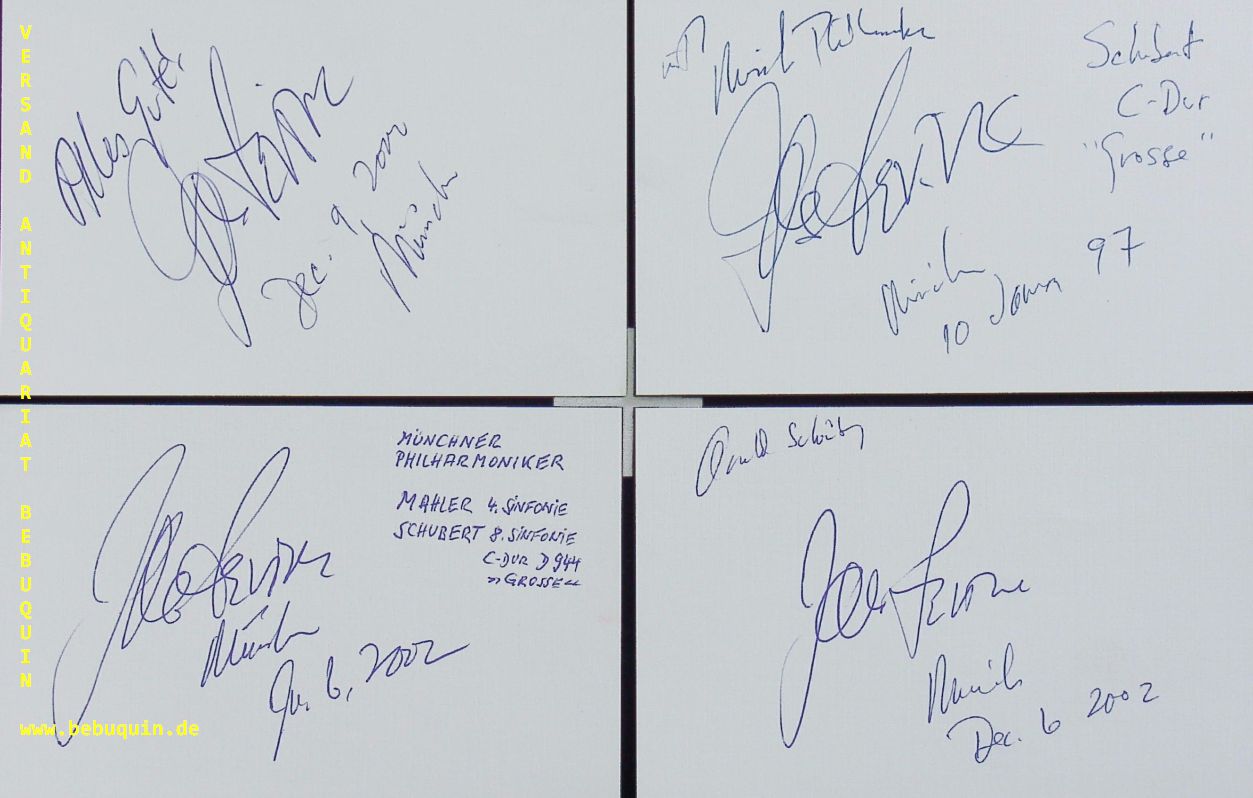 LEVINE, James (Dirigent): 7 eigenhändig signierte und datierte Autogrammkarten. München (Philharmonie), 1997 + 2003. 8 x 12,5 cm. 7 Karteikarten. James Lawrence „Jimmy“ Levine (* 23. Juni 1943 in Cincinnati, Ohio) ist ein US-amerikanischer Dirigent und Pianist, der von 1971 bis 2016 an der Metropolitan Opera als Dirigent wirkte. Mit einer zweijährigen Unterbrechung (2013–2015) war er dort auch langjähriger künstlerischer Leiter. Er gilt als einer der führenden Dirigenten der USA. (Wikipedia)