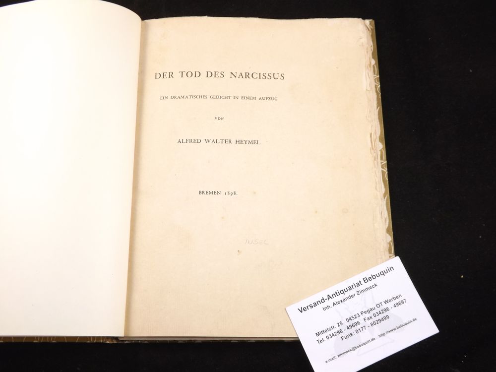 HEYMEL, Alfred Walter: Der Tod des Narcissus. Ein dramatisches Gedicht in einem Aufzug. Bremen 1898. Gr. 8°. 41 (1) S. als Manuskript bei Drugulin auf Insel-Bütten gedruckt, mit dem Insel-Wasserzeichen, das erst im Oktober 1899 zu erscheinen begann. ill. moderner Pb. dem OEinband nachempfunden. feines, bibliophiles Stück. 1 von 200 Expl. der EA der ersten Veröffentlichung als Privatdruck. Sarkoswki 730.