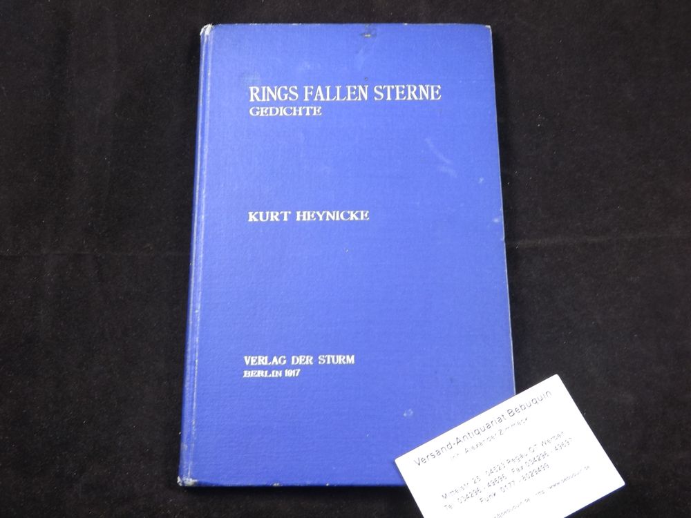 HEYNICKE, Kurt: Rings fallen Sterne. Gedichte. Berlin (Sturm), 1917. Gr. 8°. 64 S. dunkelblaues OLn. mit silbergeprägter Schrift. EA des Erstlingswerks WG² 1 mit mehrzeiliger, eigenhändiger, datierter und voll signierter Widmung des Autors an die expressionistische Dichterin Frida Bettingen (siehen Raabe 29) und deren Ex libris verso Titelblatt.