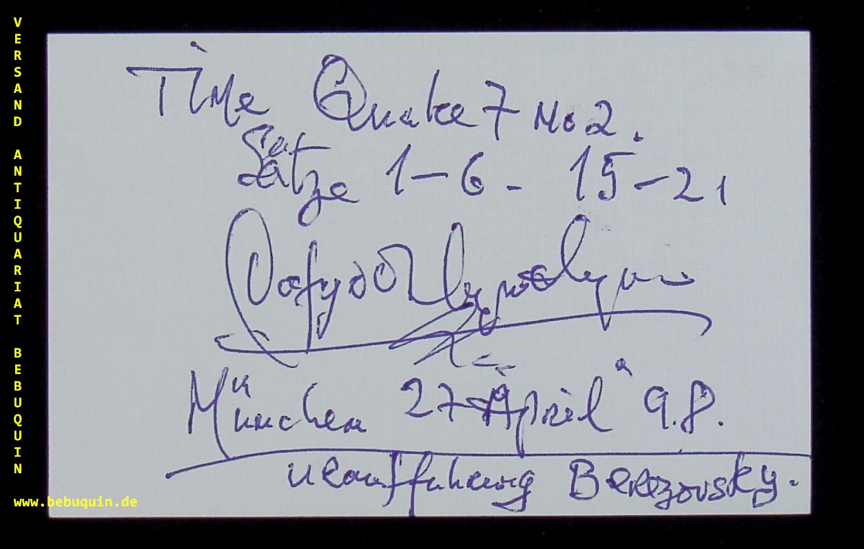 LLYWELYN, Dafydd (Komponist): eigenhändig signierte und datierte Autogrammkarte: Time Quake 7 No 2. München (Philharmonie), 27.4.1998. 8 x 12,5 cm. Karteikarte. Dafydd Llywelyn (* 10. Januar 1939 in Südwales; † 25. März 2013 in München) war ein walisischer Komponist, Pianist, Dirigent und Pädagoge. (Wikipedia)