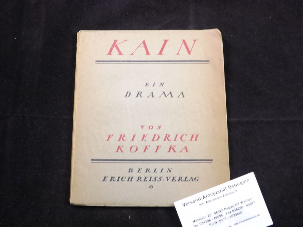 KOFFKA, Friedrich: Kain. Ein Drama. Berlin (Reiss), 1918. 37 S., 1 Bl. OKart. Ecken etwas bestoßen. EA des Erstlingswerks Kosch IX, 155. Raabe 165.1.