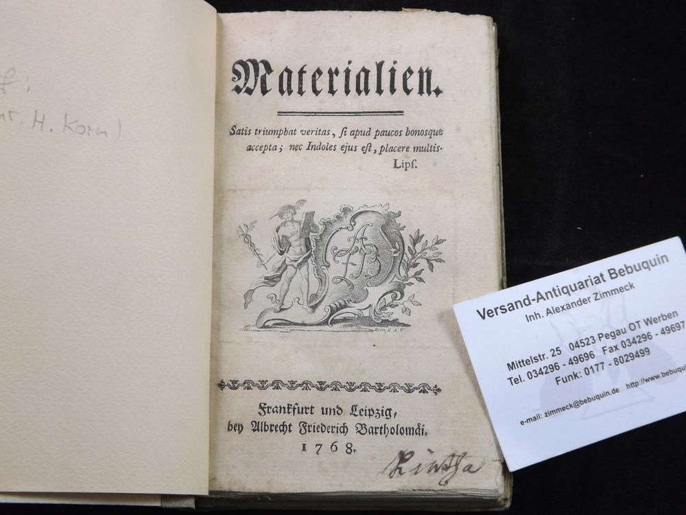 KORN, Christian Heinrich: Materialien. Frankfurt (Bartholomäei), 1768. 160 S. mit gestochener Titelvignette von Rein und 15 figürlichen Holzschnitt-Kopf- und Schlussvignetten. Pb. der Zeit mit neuem Rücken und montiertem Papierrückenschild. NaT, gute zeitgemäße Erhaltung. EA des Erstlingswerks des Juristen und Romanciers. Enthält Betrachtungen über „Aberglaube und Unglaube; Richelieu und Mazarin, Friedrich; Peter der Erste und Peter der Dritte; Vom Tode; Heinrich der Vierte; Religion, Atheisten, Selbstmord; Voltaire“ u.v.m.