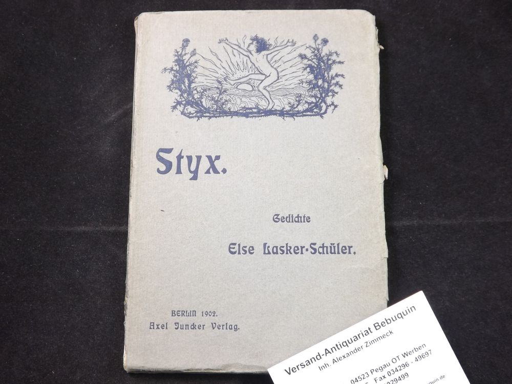 LASKER-SCHÜLER, Else: Styx. Gedichte. Berlin (Juncker), 1902. 77 (1) S., 1 Bl. mit figürlicher Titelvignette von Fidus. ill. OKart von Fidus. unterer Rücken etwas abgerieben, Kanten unbeschnitten, Lasker Schüler Briefmarke auf Innendeckel geklebt, insgesamt gutes Ex. EA des Erstlingswerkes WG² 1; Raabe 182.1.