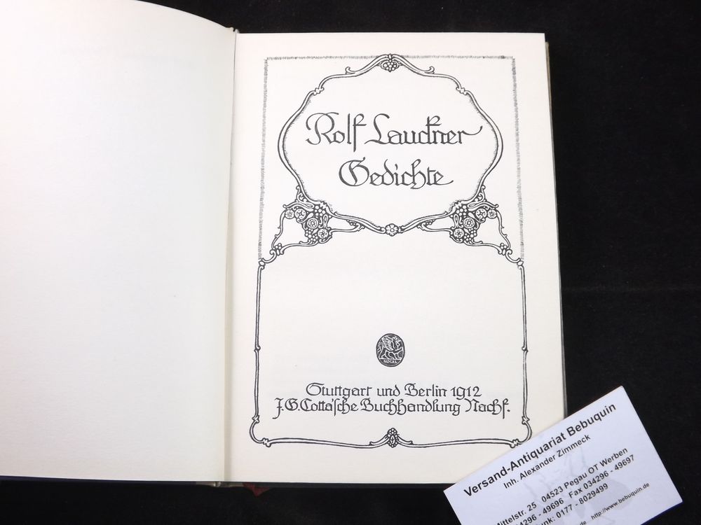 LAUCKNER, Rolf: Gedichte. Stuttgart (Cotta), 1912. 80 (4) S. OPb. mit Rückenvergoldung und Kopfgoldschnitt. Einband mit Lichtrand. EA des Erstlingswerks WG² 1; Raabe 184.1.