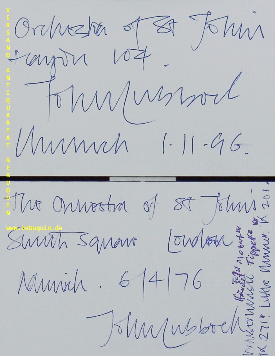 LUBBOCK, John 2 eigenhändig signierte und datierte Autogrammkarten. München, 19i76 + 1996. 8 x 12,5 cm. 2 Karteikarten. John Lubbock is an English music conductor and singer, and founder of the Orchestra of St John’s Smith Square, now known as the Orchestra of St John’s (OSJ), which he has brought to prominence including performances at The Proms as well as engaging in outreach and charity work. (Wikipedia)
