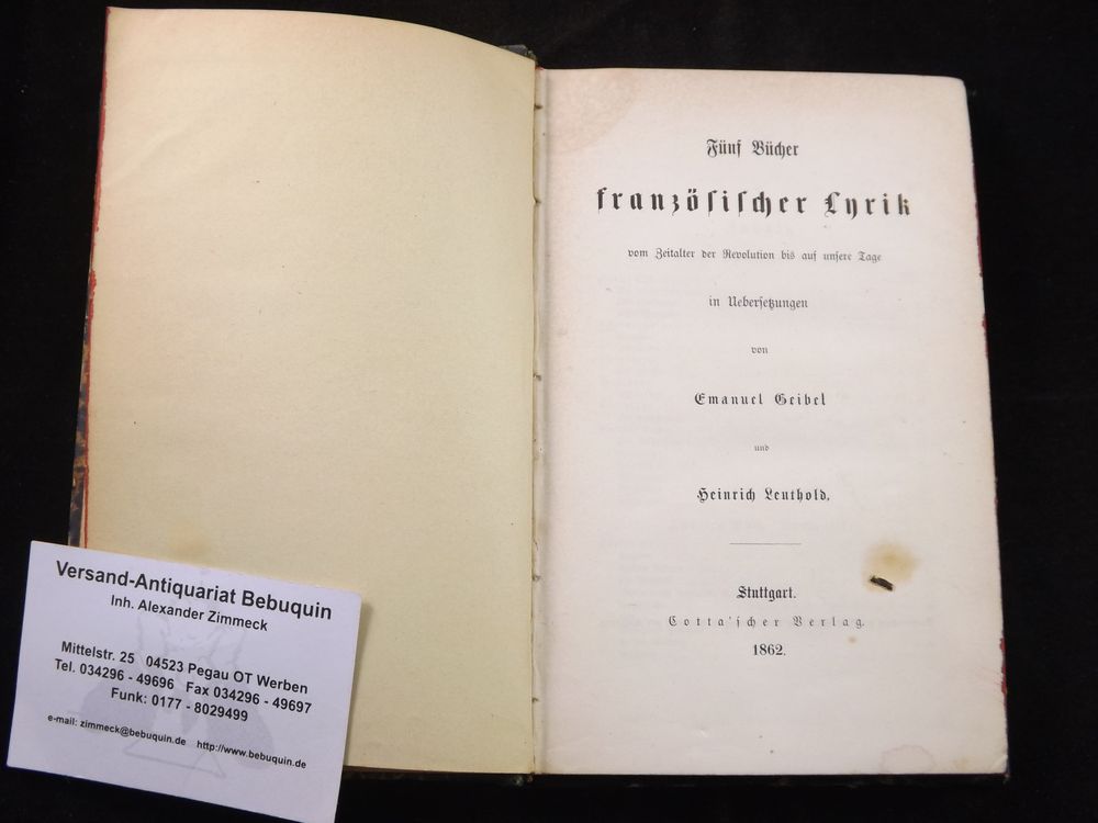LEUTHOLD, Heinrich + GEIBEL, Emanuel: (Übers. und Hrsg.) Fünf Bücher französischer Lyrik vom Zeitalter der Revolution bis auf unsere Tage. Stuttgart (Cotta), 1862. kl. 8°. VI, 268 S. HLdr. der Zeit mit goldgeprägtem Rücken. Kanten kaum berieben, vereinzelt stockfleckig. EA des Erstlings von Leuthold WG² 1 und Geibel WG² 22 mit Gedichten von Chateaubriand, Hugo, Musset, Beranger, Gautier u.a.