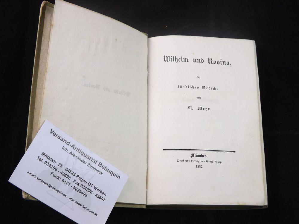 MEYR, Melchior: Wilhelm und Rosina, ein ländliches Gedicht. München (Franz), 1835. kl. 8°. 278 S. Pb. der Zeit mit goldgeprägtem Lederrückenschild. Kanten etwas berieben, vereinzelt braunfleckig, gutes Ex. Sehr seltene EA der ersten Veröffentlichung des Schelling-Schülers. Melchior Meyr (1810-1871) studierte zunächst Jura. Als Verehrer Schellings wechselte er bald über zur Philosophie, schrieb in der nach `Hermann und Dorothea` beliebten hexametrischen Form sein erstes Versepos `Wilhelm und Rosina` und promovierte 1836 in München. – Ab 1840 lebte er als Schriftsteller und Mitarbeiter versch. Zeitschriften mit Unterstützung des bayerischen Kronprinzen Maximilian (geb. 1811; 1848-1864 Maximilian II. Joseph, König von Bayern) nach Berlin und kehrte 1852 nach München zurück (Killy VIII,149 u. DBE). (Wikipedia)