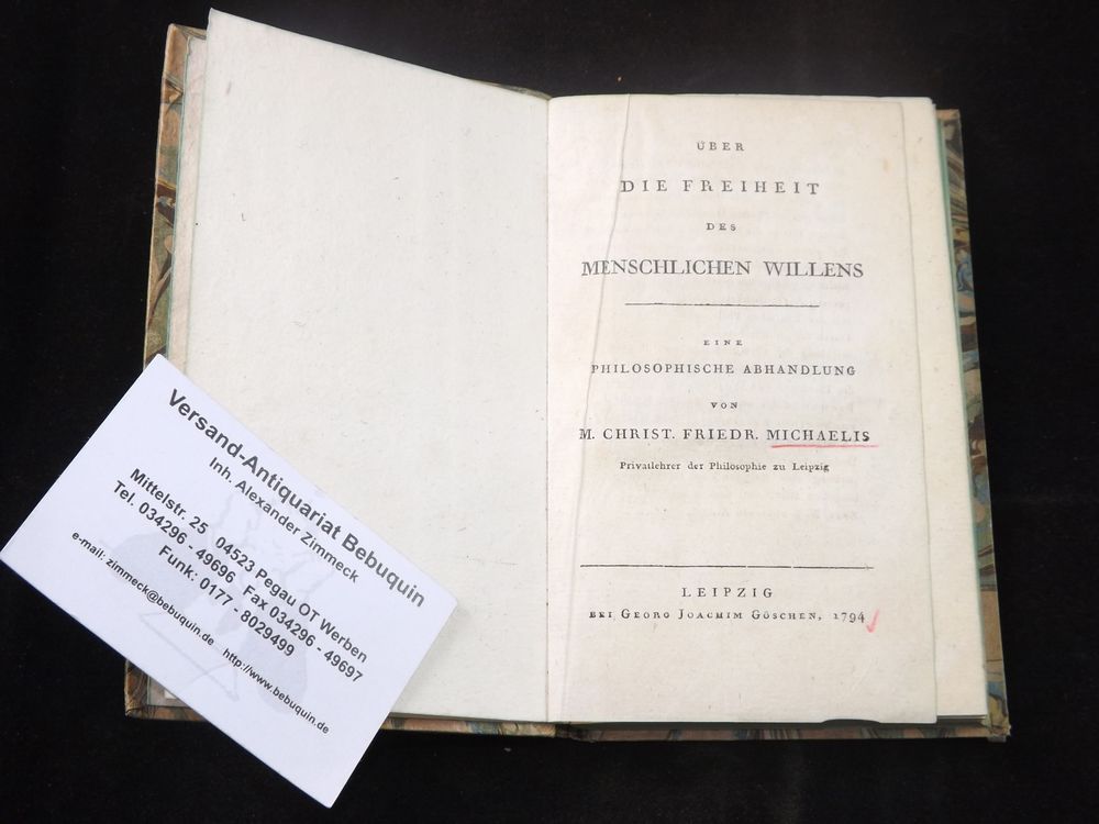 MICHAELIS, Christian Friedrich: Über die Freiheit des menschlichen Willens. Eine philosophische Abhandlung. Leipzig (Göschen), 1794. kl. 8°. XVI, 132 S. marmor. Pb. der Zeit. StaV, wenige Rotstiftanstreichungen. Sehr seltene EA des Erstlingswerks des Philosophen, Musikästhetikers und Schriftstellers.