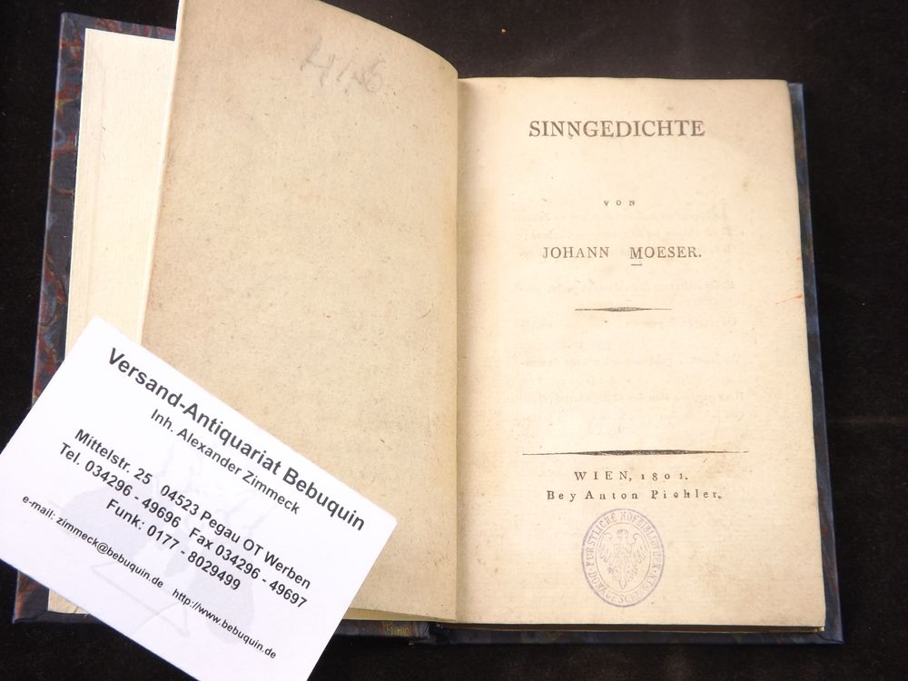 MOESER, Johann: Sinngedichte. Wien (Pichler), 1801. kl. 8°. 165 S., 6 Bl. neues Pb. mit goldgeprägtem Rückenschild. EA der seltenen ersten Veröffentlichung Goedeke VI, 577, 86, 1.